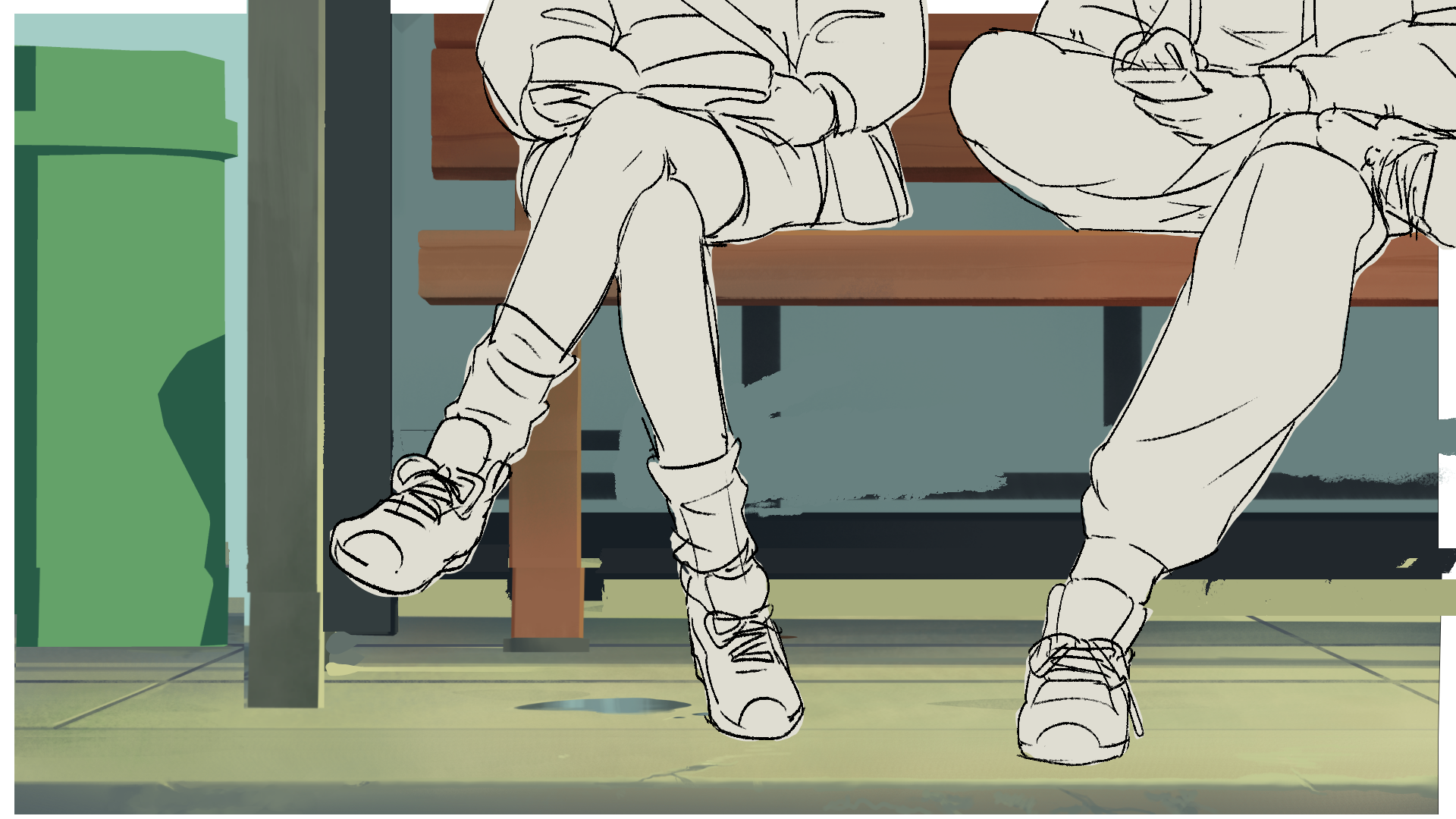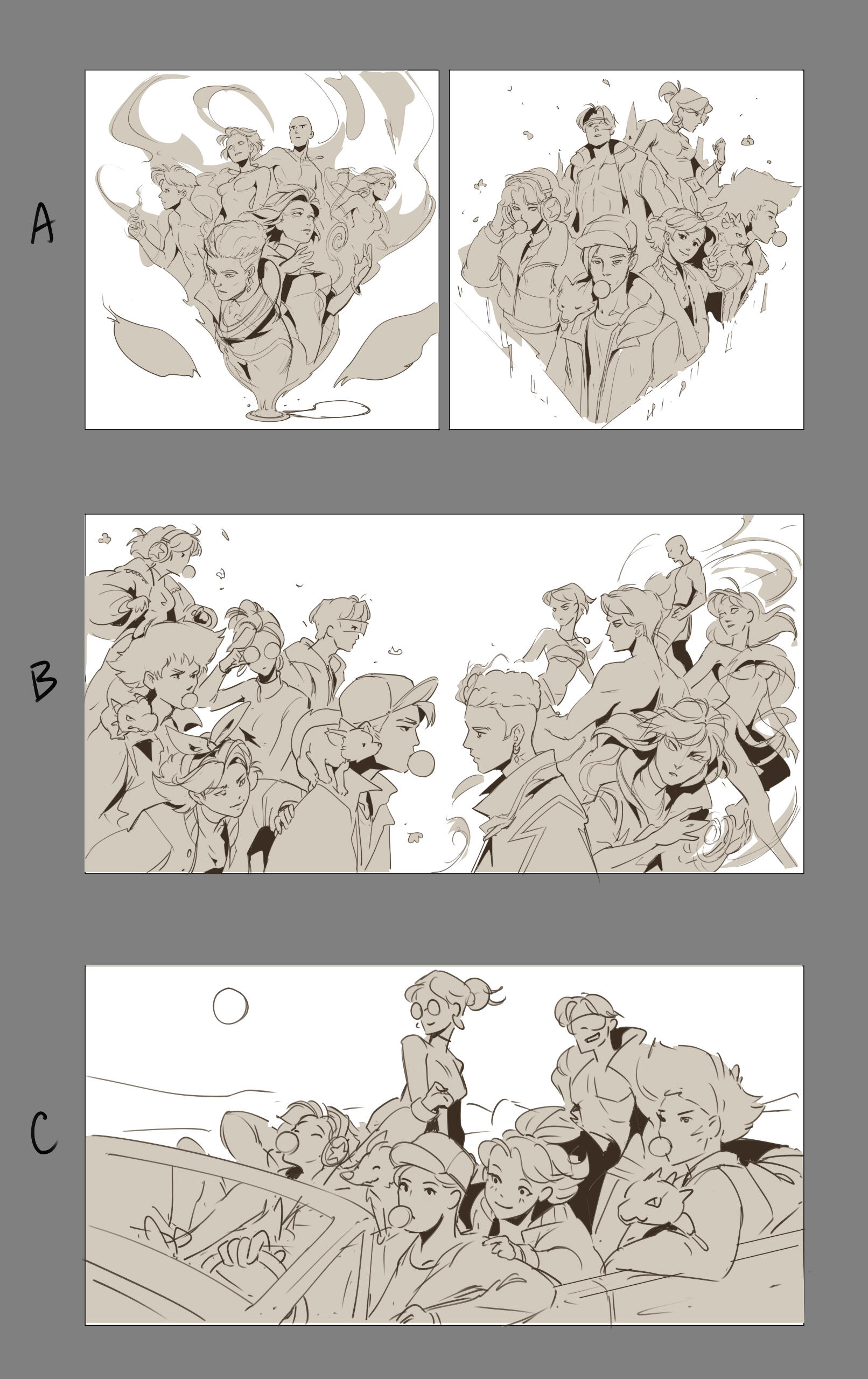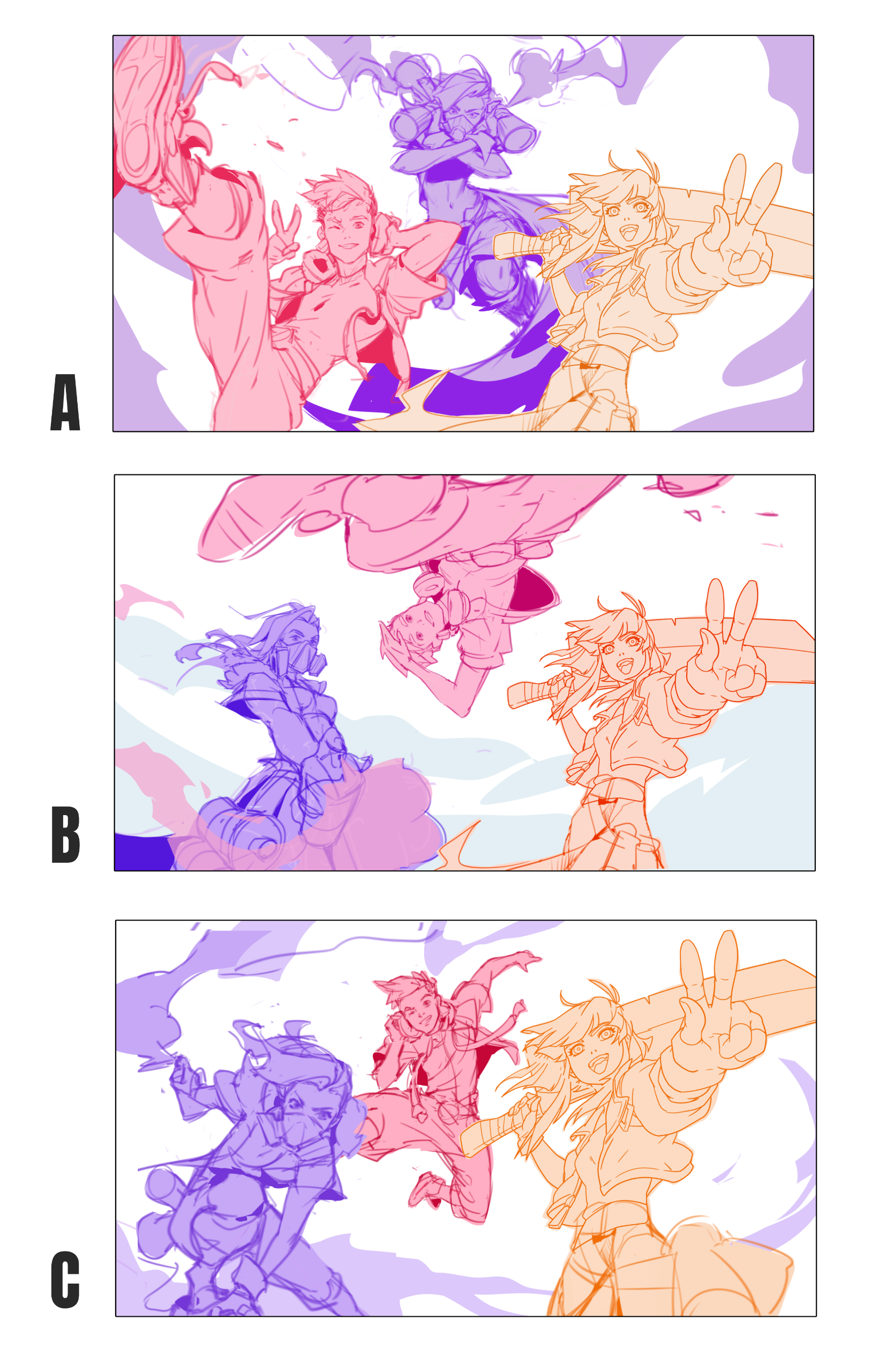 To the left are thumbnails for the original comp! Kana (in orange) had already been drawn and we couldn't touch that asset, so I was trying to position the other characters around her in a way that made sense and created good flow.