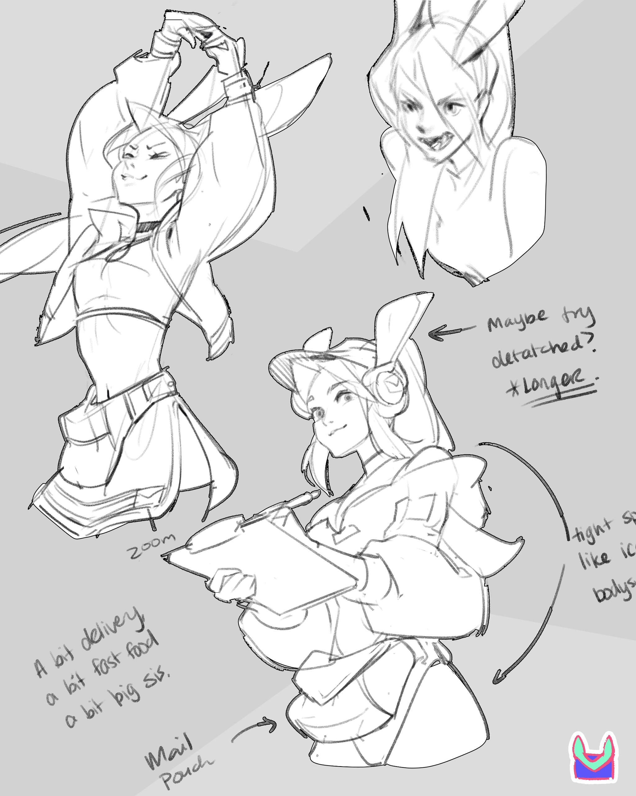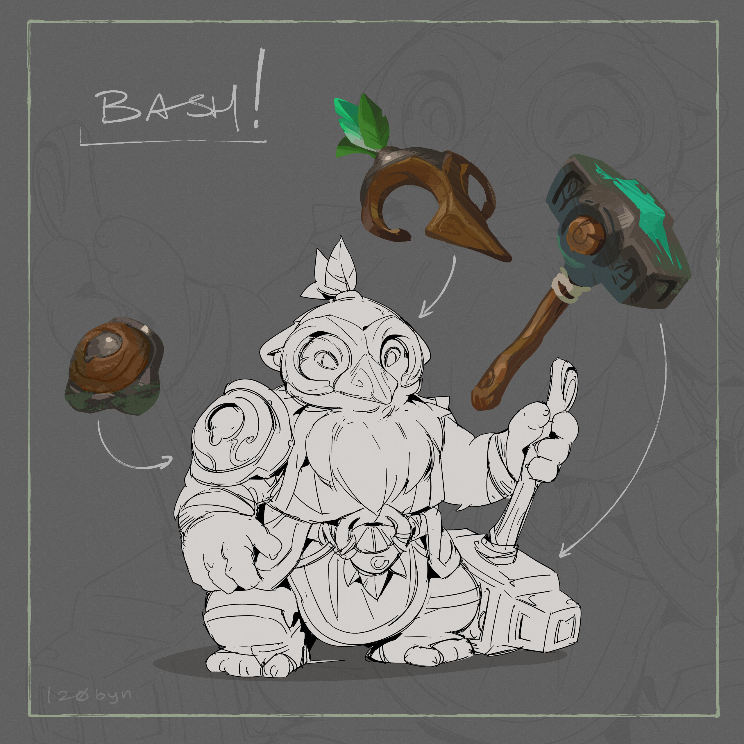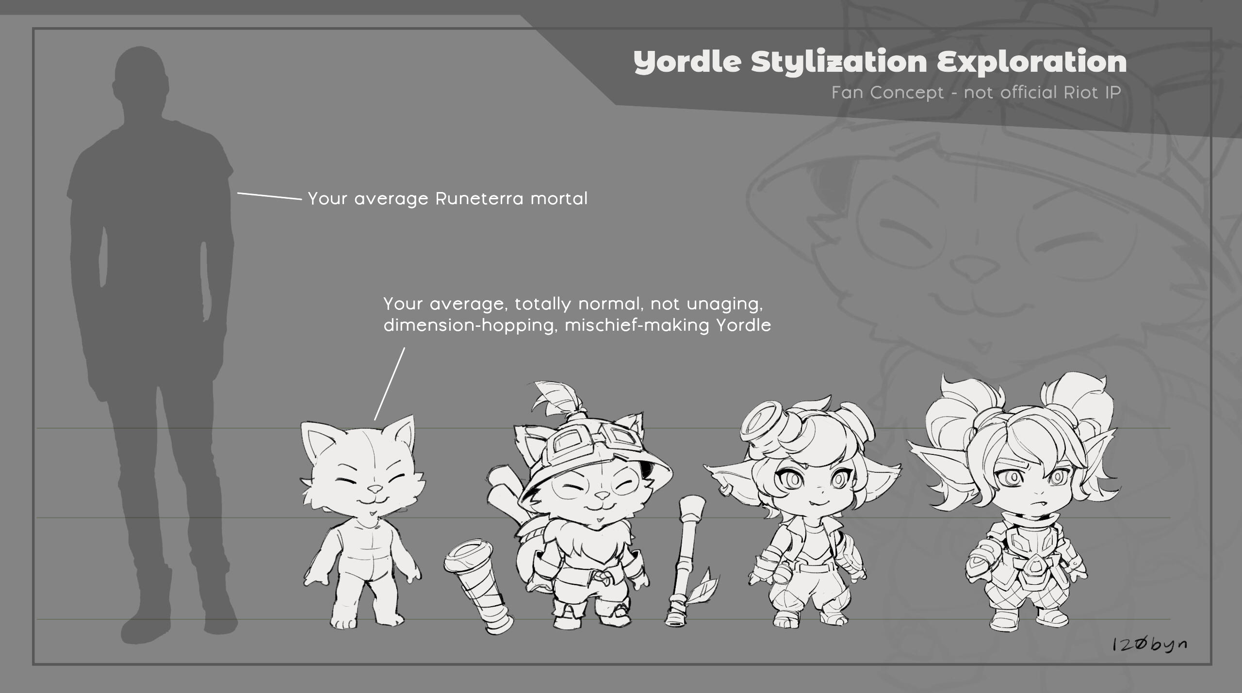 Even though these characters are already designed, I kind of wanted to take a stab at the stylization and proportions. I mostly wanted to see if I could get characters like Tristana and Poppy—who are much more humanlized—to feel like they share the same species as Teemo and Rumble. I also prefer to imagine them being a bit chunky, more creature-like; a little bit more like the Lalafell in FFXIV. I feel like this chunky chibi-inspired shape suits their proportions pretty well.I changed up their gear a bit, but it's not all completely solved yet. I think I'd have to do a deep dive and sort them out in detail - esp Poppy's armor, which I'd love to consolidate some of the shape language.