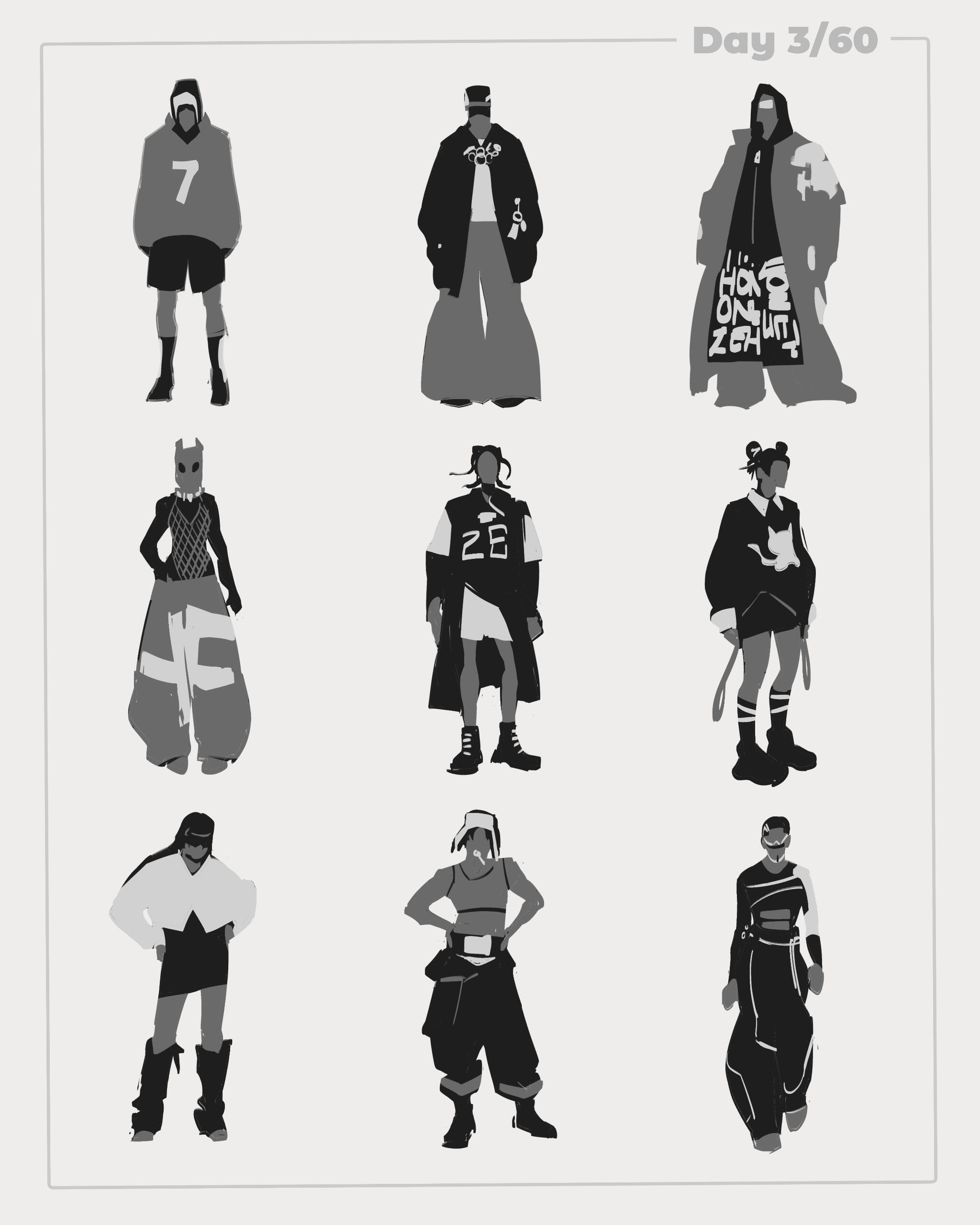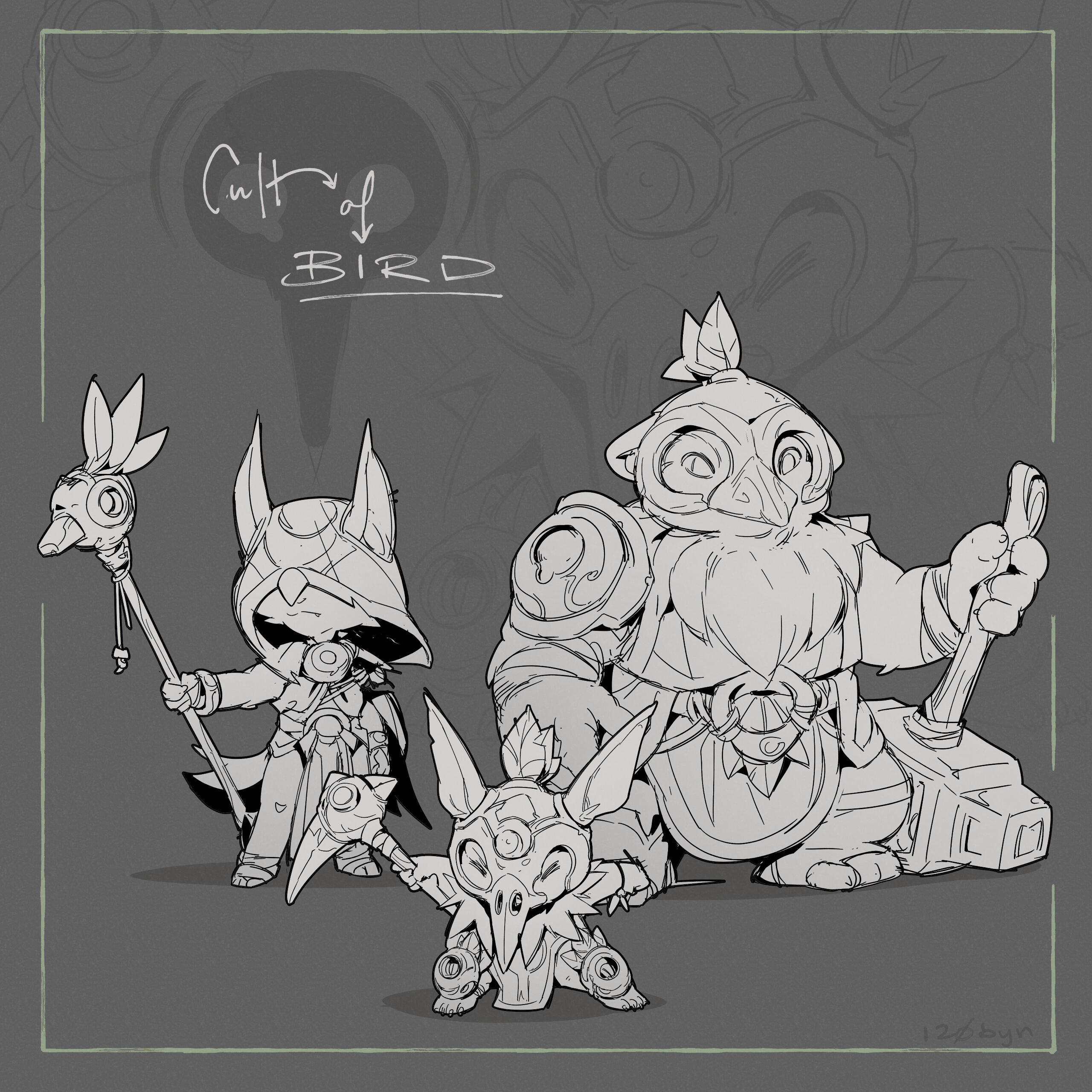 1-day concept jam of a bird gang/cult, to be paired with the hat-bird I designed a few days ago. I imagine them as bird worshipers with the goal of fending off adventurers and trying to get the birds to be as big as possible. >:3If I revisit these guys, I would do a few passes on each of them, and then design all pieces of their outfit & also a movement/ability sheet.