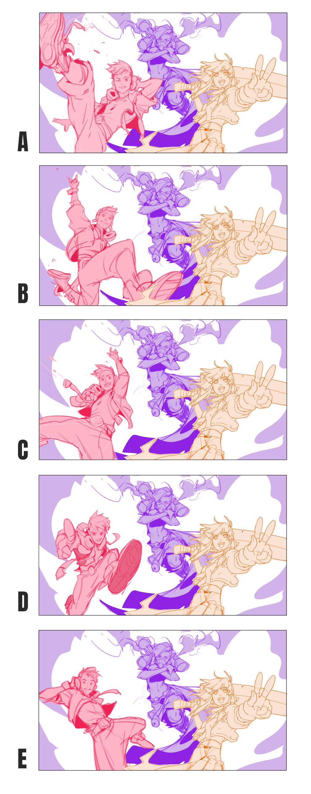 After the first round, we settled on composition A, but Jet (in red) needed some pose explorations. I tried a few ideas for other dynamic poses that would suit his character. None of these really hit the mark, so ultimately Alvin was able to step in and take Jet to where he needed to be!