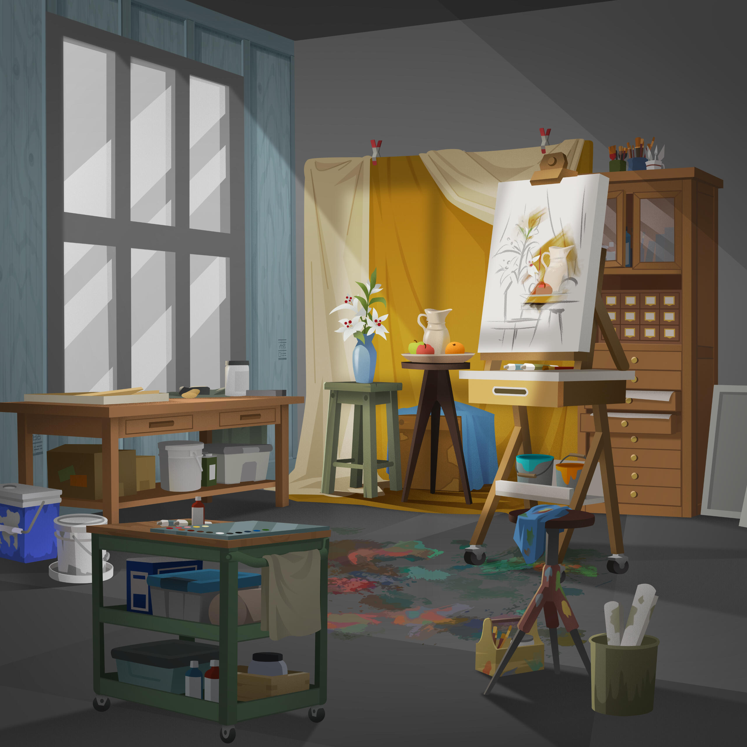 This Artist Studio Kit was both the most fun and perhaps one of the most time consuming due to the variety of props.I really liked the challenge of working in the middle-ground between dimensionality and graphic flatness; things like the fruit and vases were especially challenging because, unlike more geometric shapes, it was hard to know how much form we were allowed to render.The painting itself was one of the few times I got to use non-vector shapes to simulate the drawn feel. I painted in the colored areas with a layer mask, and I think it simulated the brush-stroke feel quite well.