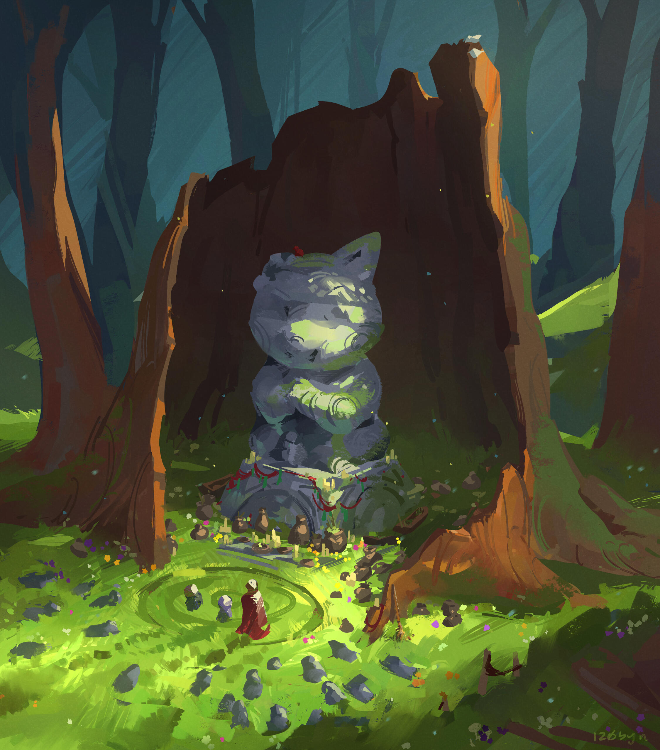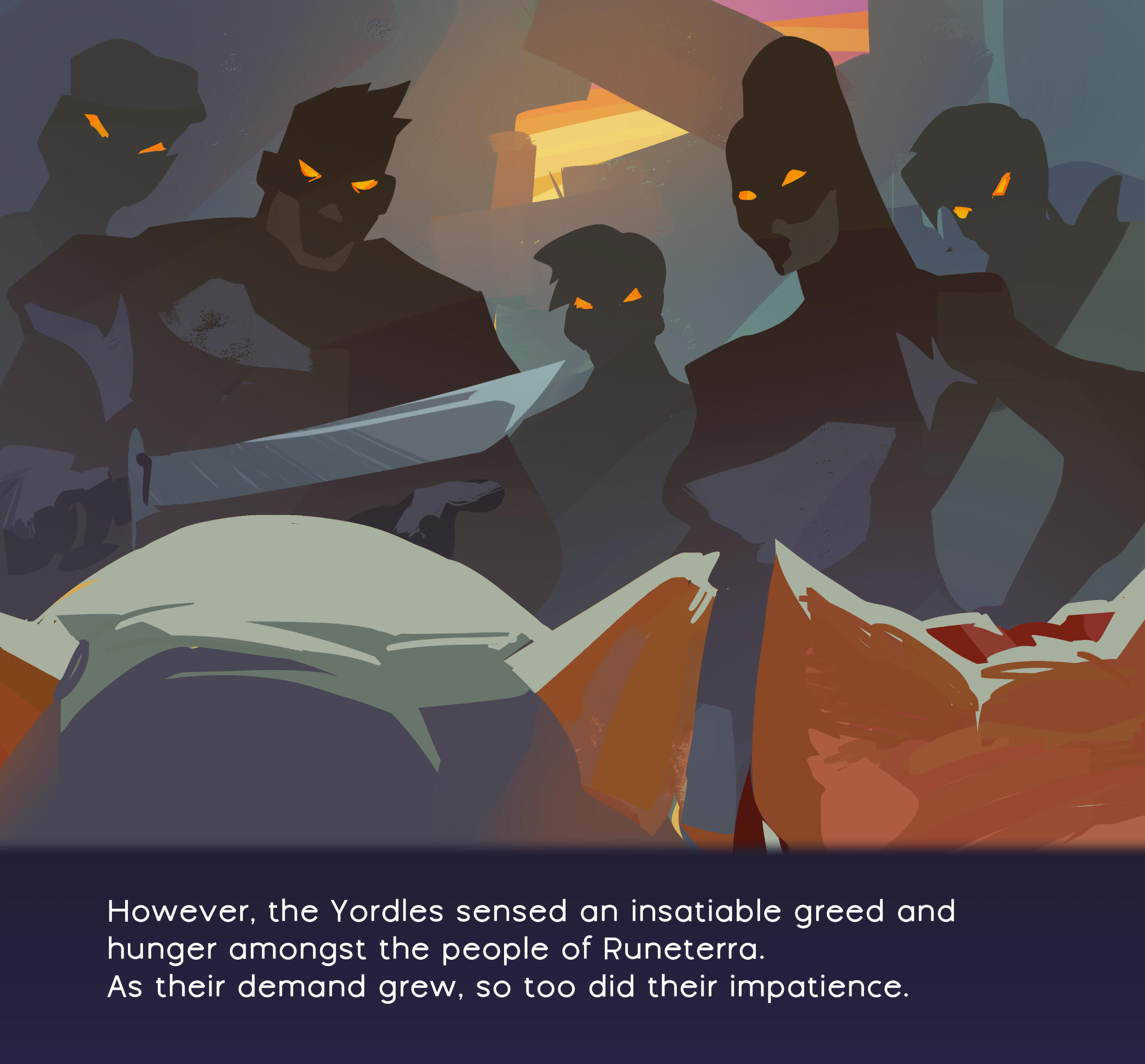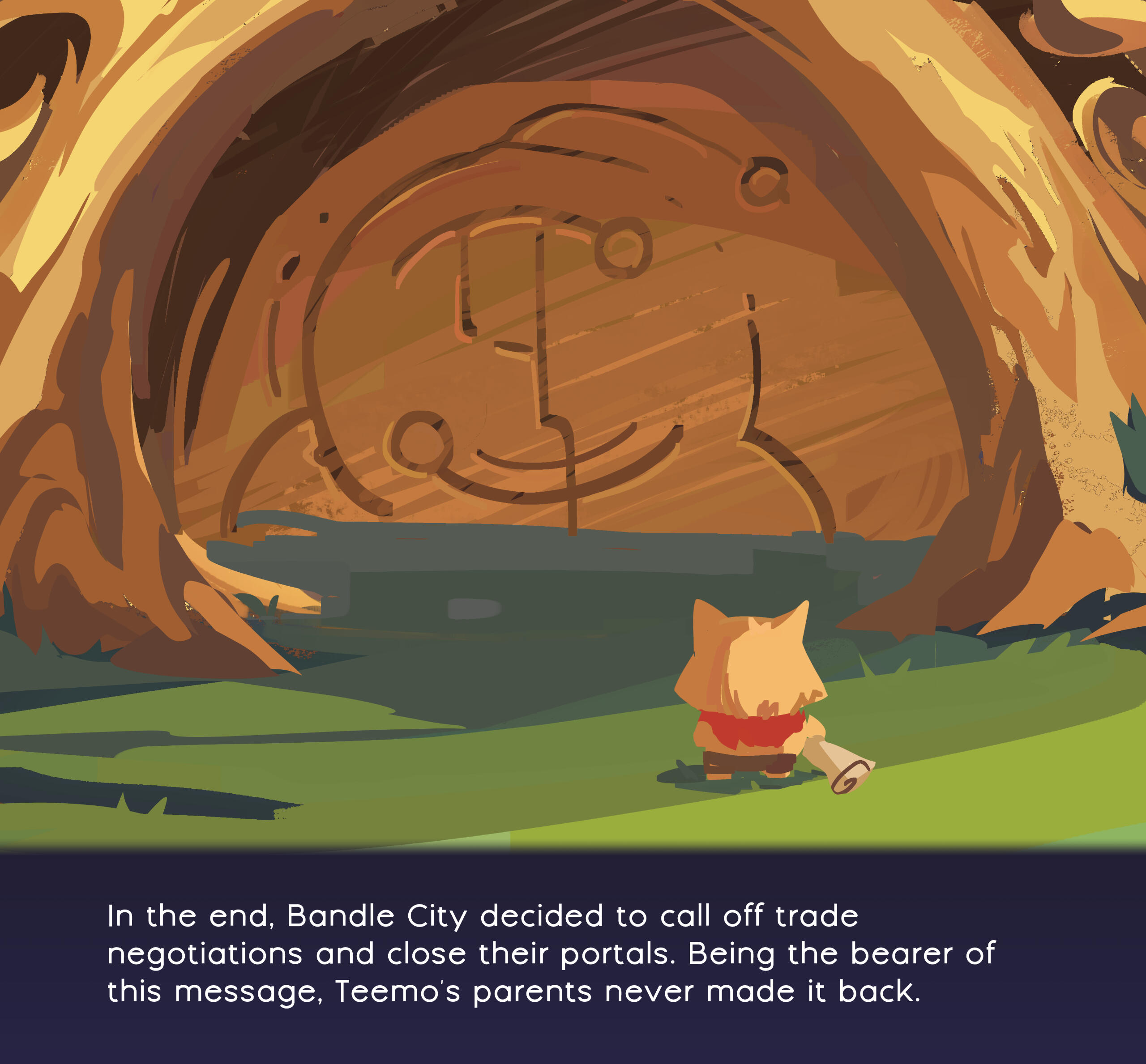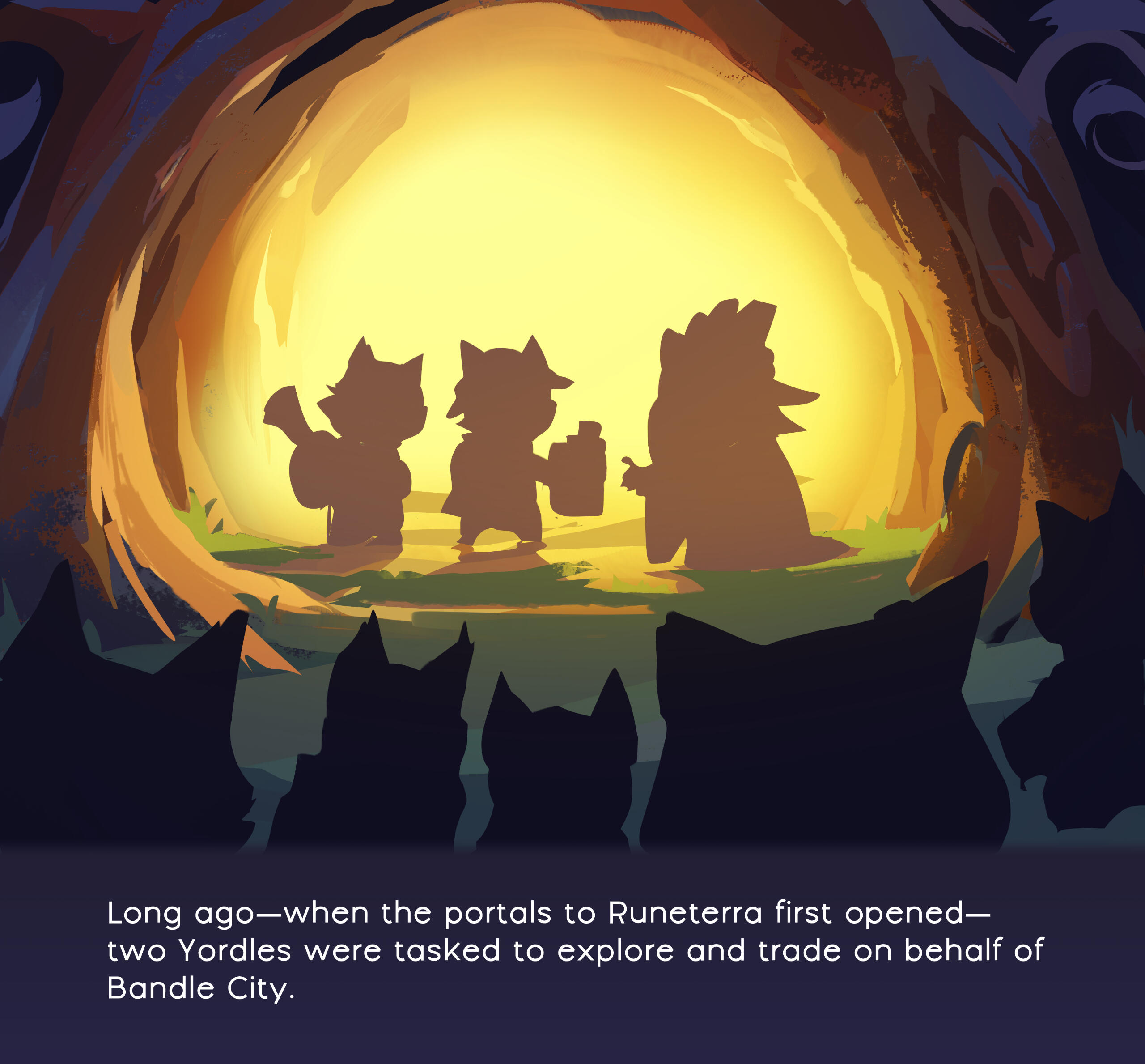 I had this idea that maybe, during a trade war with Runeterra, there was a young Yordle who would steal goods from Bandle City and smuggle them in.Over time, he became somewhat of a god-figure. He enjoyed the power, attention, and respect; it was a level he never experienced in Bandle City.But no good thing lasts forever; the Yordles caught on to the theft and started locking their goods. He was no longer able to supply the village that had grown entirely reliant on him.He never returned to face his people. If he did, he would see the statue they had erected in his honor, and their stiffened bodies forever awaiting his return.