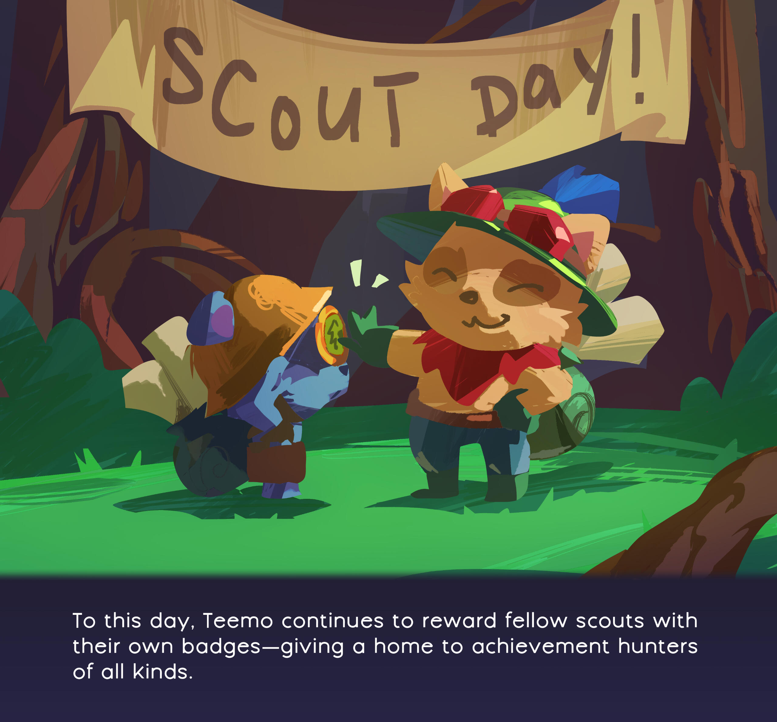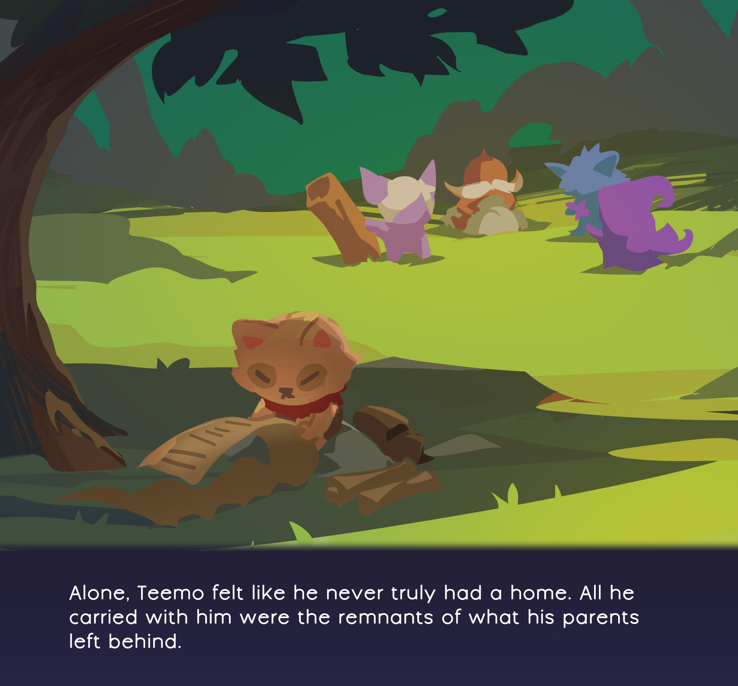 I wasn't able to get a good sense of Teemo's character from the lore page alone, so I decided to storyboard this fanfic that I'll be using to ground my project a bit. I really enjoy grounding characters in stories and trying to understand them. Maybe it's a bit much, but I find it can really help make them come alive!This series was done over the course of a day, and you can see my painting skills get better by the end of it. @_@With this in mind, I feel more comfortable and confident designing his hideout and props!
